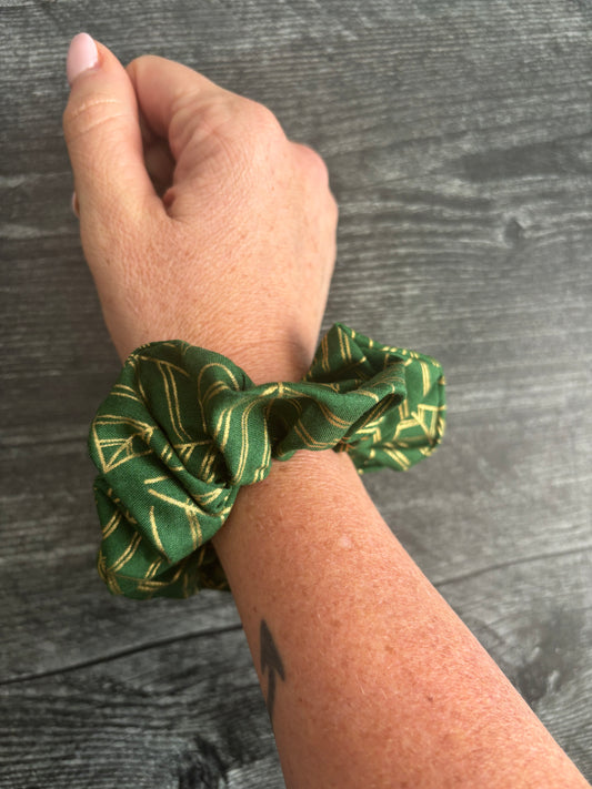 Sparkly Gold Leaf Print on Green - Cotton Scrunchie