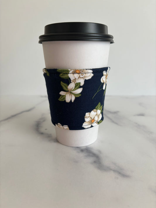 Magnolias on Navy - Reusable Coffee Sleeve