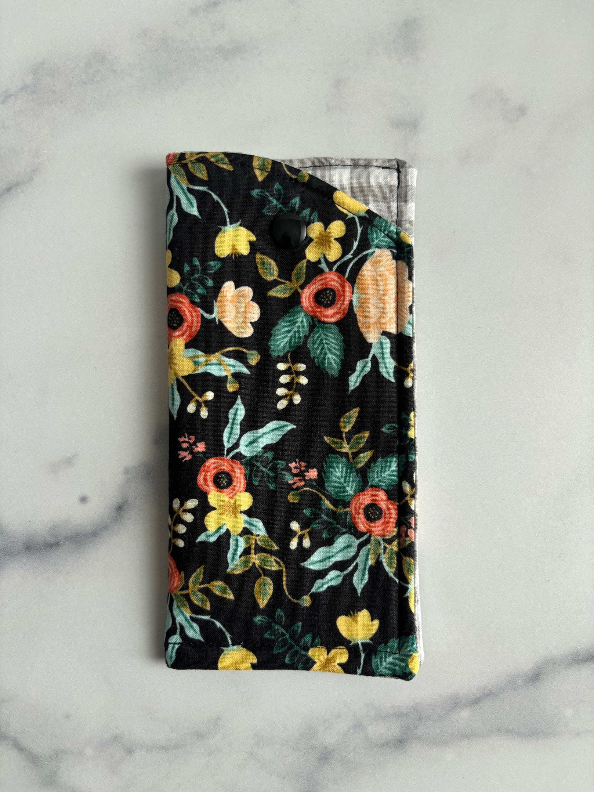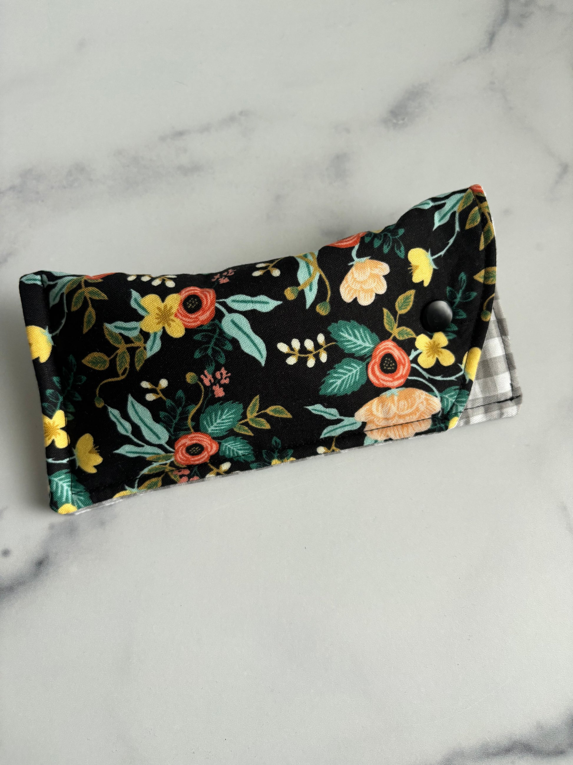 Our glasses cases are the perfect way to keep your sun glasses or eye glasses safe while allowing you to express yourself with a little pop of pizzazz. They all come fully lined and interfaced with a fluffy quilting stabilizer perfect for keeping your frames and lenses protected. They also come with a snap enclosure allowing you to keep your glasses safe from sliding out while they stay protected in their comfy little pouch. They make a great gift as most people would appreciate something practical and beautiful especially if it’s handmade.