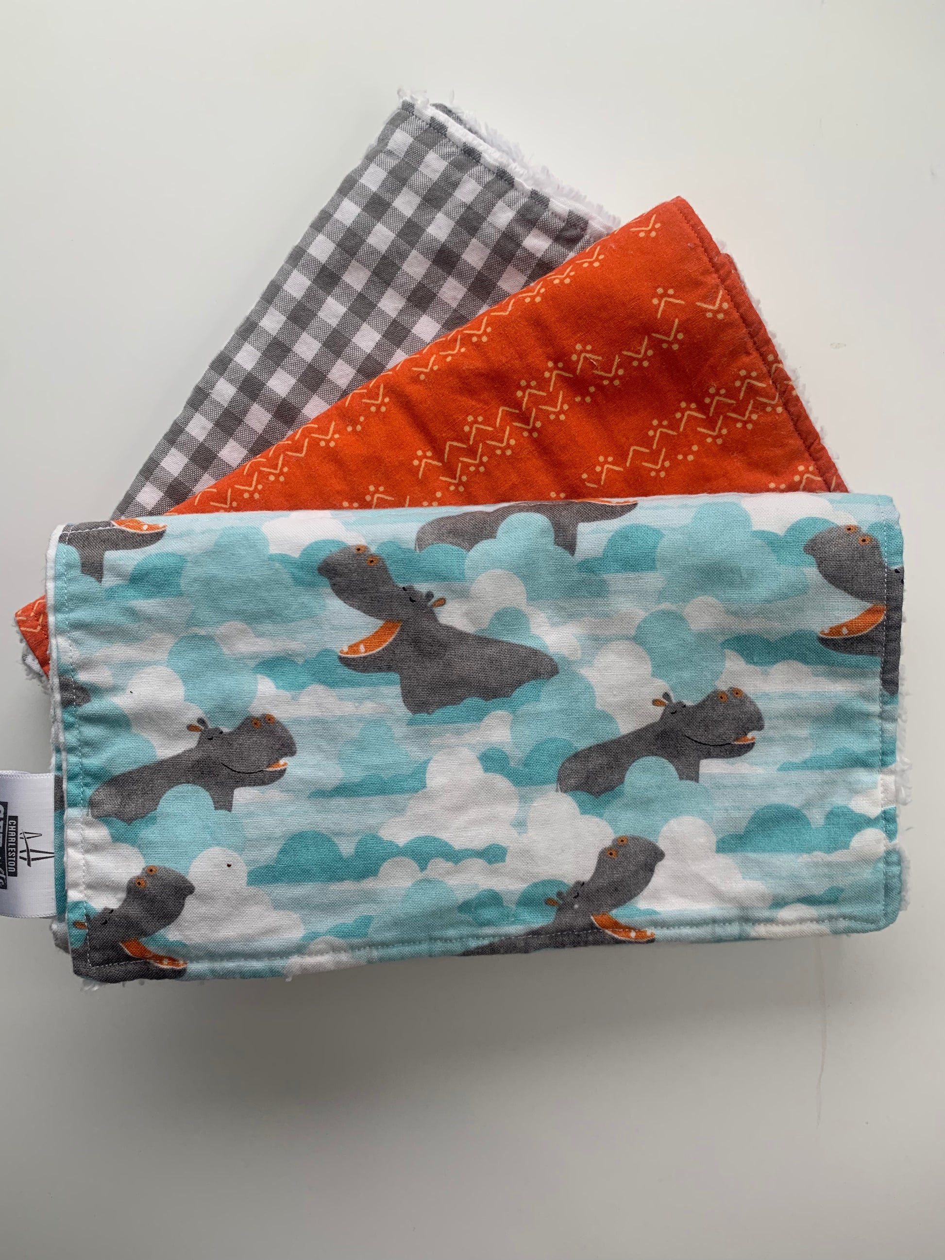 Each burp cloth is handmade and measures approximately 9"x15.5”.